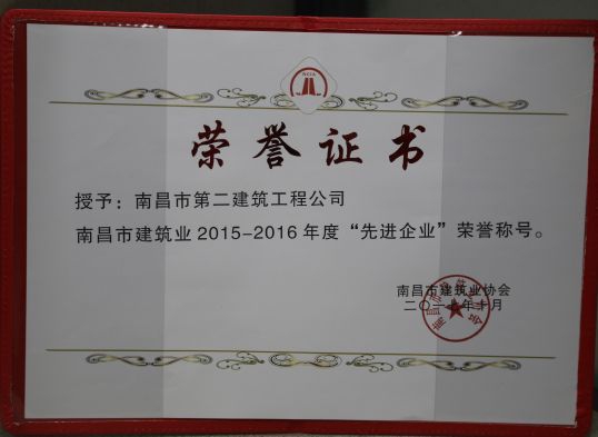 南昌市建筑業協會對公司頒發了南昌市建筑業2015-2016年度“先進企業”榮譽稱號,對公司建造師章壽榮、何靜、胡建平、高波頒發了南昌市建筑業2015-2016年度“優秀建造師”榮譽稱號;中國建筑業協會對章壽榮頒發了全國建筑業企業優秀項目經理榮譽稱號。
